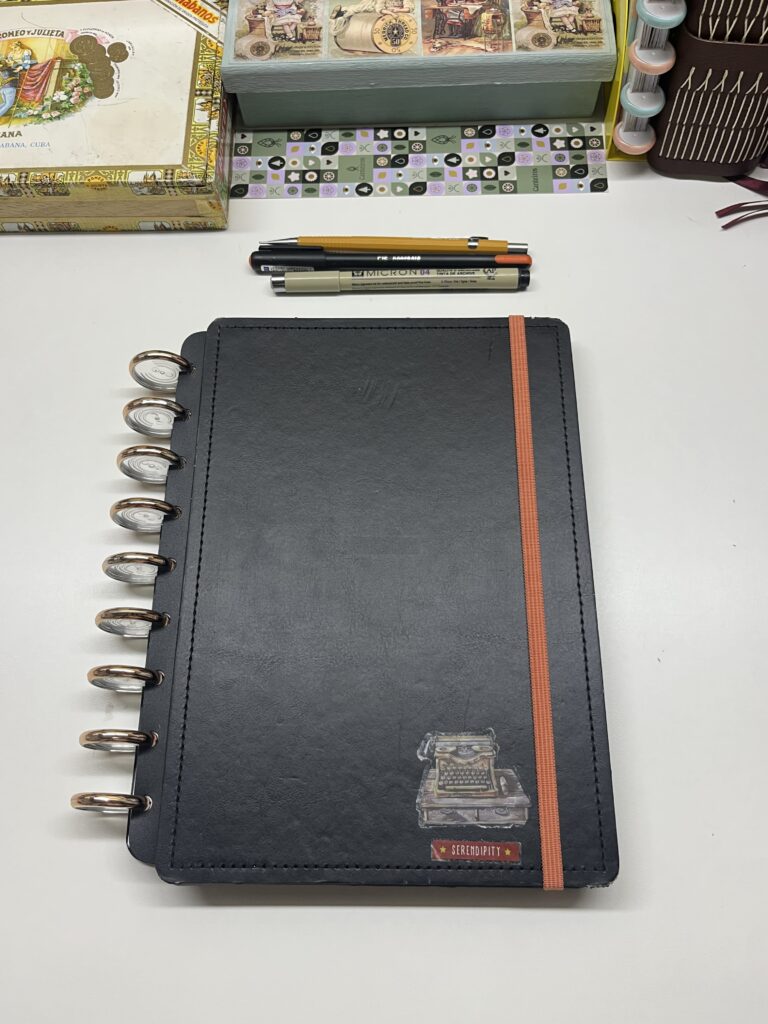 A capa dele é a mais simples possível, toda preta e desta vez coloquei discos dourados e elástico ocre, os adesivos são muito antigos mas gosto demais: serendipity é uma excelente palavra para se manter por perto junto à máquina de escrever.