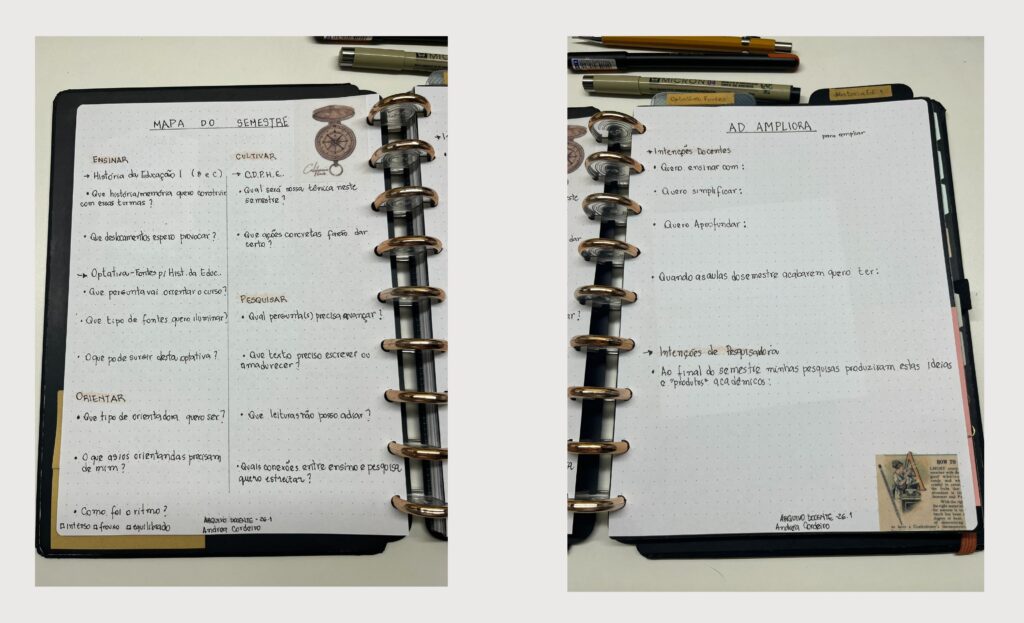 Mas o que achei verdadeiramente interessante foram as páginas iniciais que inseri: além do índice, fiz um calendário a mão que vou completar com datas do calendário acadêmicos da UFPR (muito zen fazer isso), e criei duas seções: O mapa do Semestre: para manter à vista o que quero CULTIVAR, ENSINAR, ORIENTAR E PESQUISAR neste semestre. E uma seção que chamei pomposamente de Ad Ampliora** para escrever minhas intenções docentes e de pesquisadora.