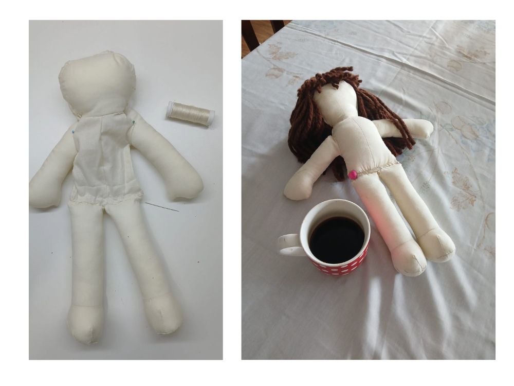 Decidi costurar uma boneca para mim. Enquanto procurava linhas e tecidos, abri o YouTube — e, por coincidência (ou destino), estava começando uma live da Nina Veiga chamada “A terapêutica no fazer de bonecas – Roda de Conversa no 3. Simpósio Artes-Manuais para Terapias“. Fui ouvindo, agulha atrevessando o pano, as falas me atravessando. De repente, aquele gesto simples de alinhavar tecido virou algo muito mais pra dentro que o avesso.