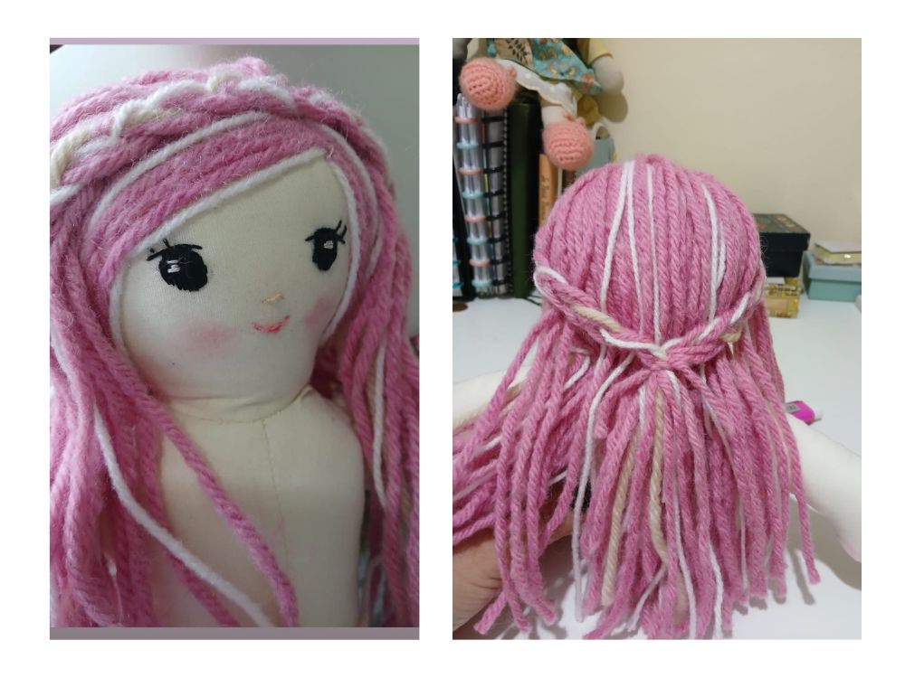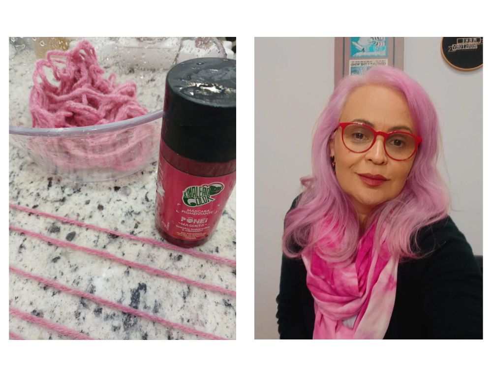 Mas, à tarde, uma amiga sugeriu: “Por que não o cabelo da cor que está o seu?” Achei a ideia boa, mas não tinha lã rosa, então inventei de tingir uma lã bege com a mesma tinta temporária que uso nos meus cabelos grisalhos quando quero ficar mais colorida. Enquanto a lã mudava de tom, percebi que o processo era sobre isso mesmo — transformar o que já existe em algo mais vivo, mais encantado, mais meu.